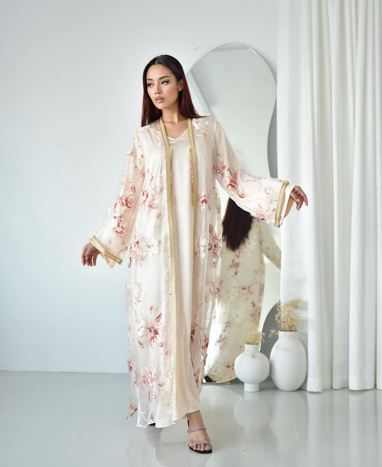 • Outer open organza  kimono kaftan with detailed neckline and full side slits edged in aakaids fully finished with gold-colorful sfifa